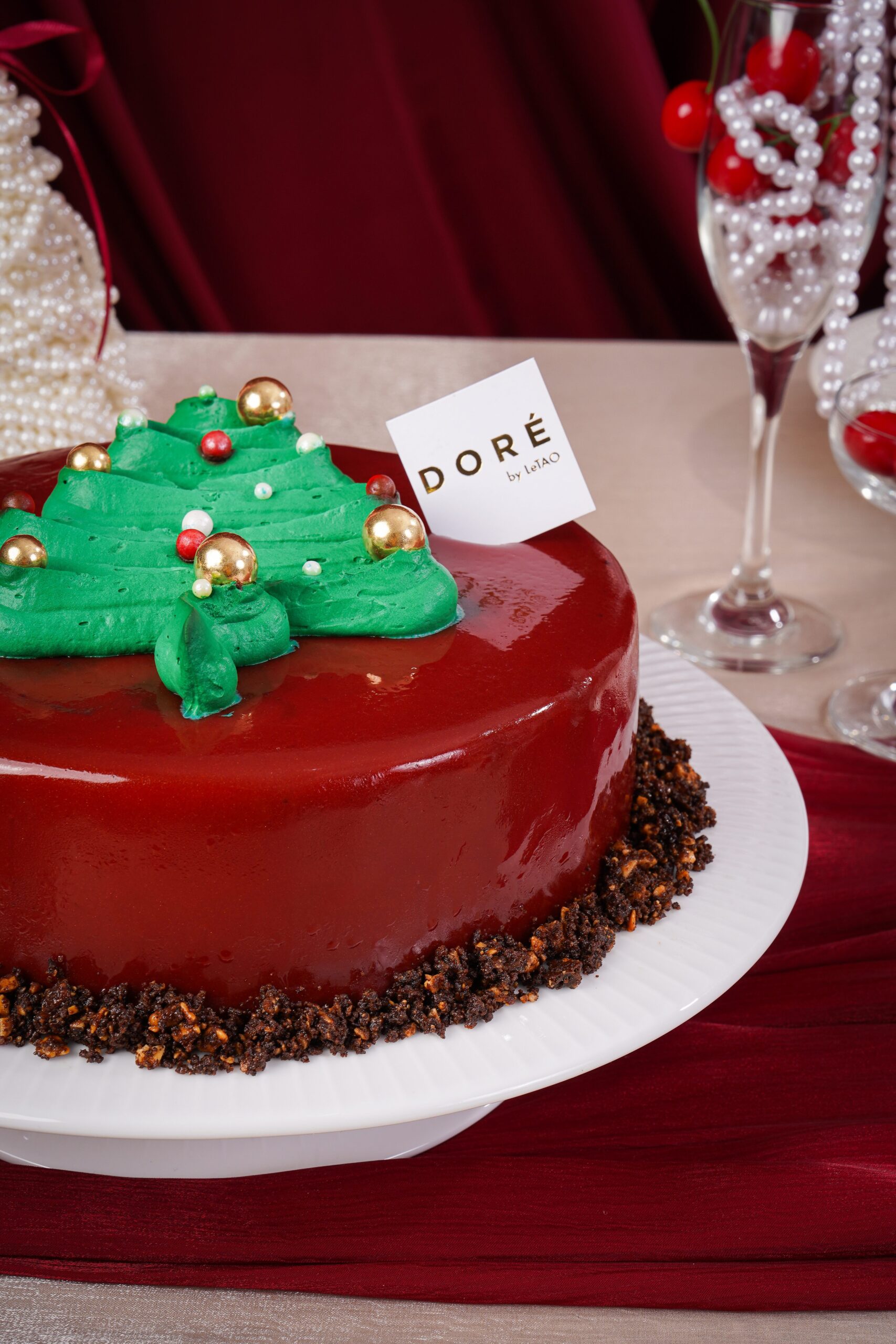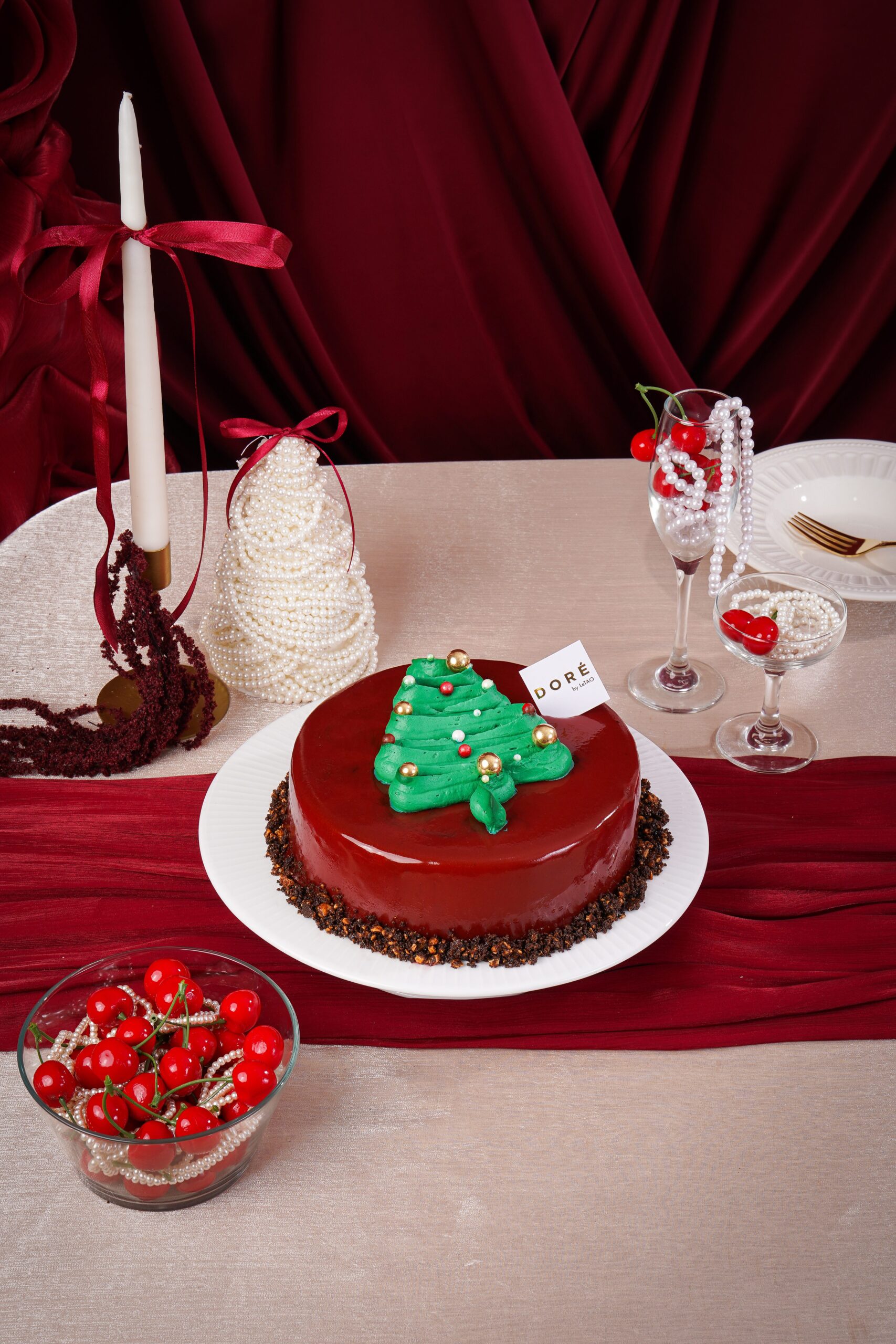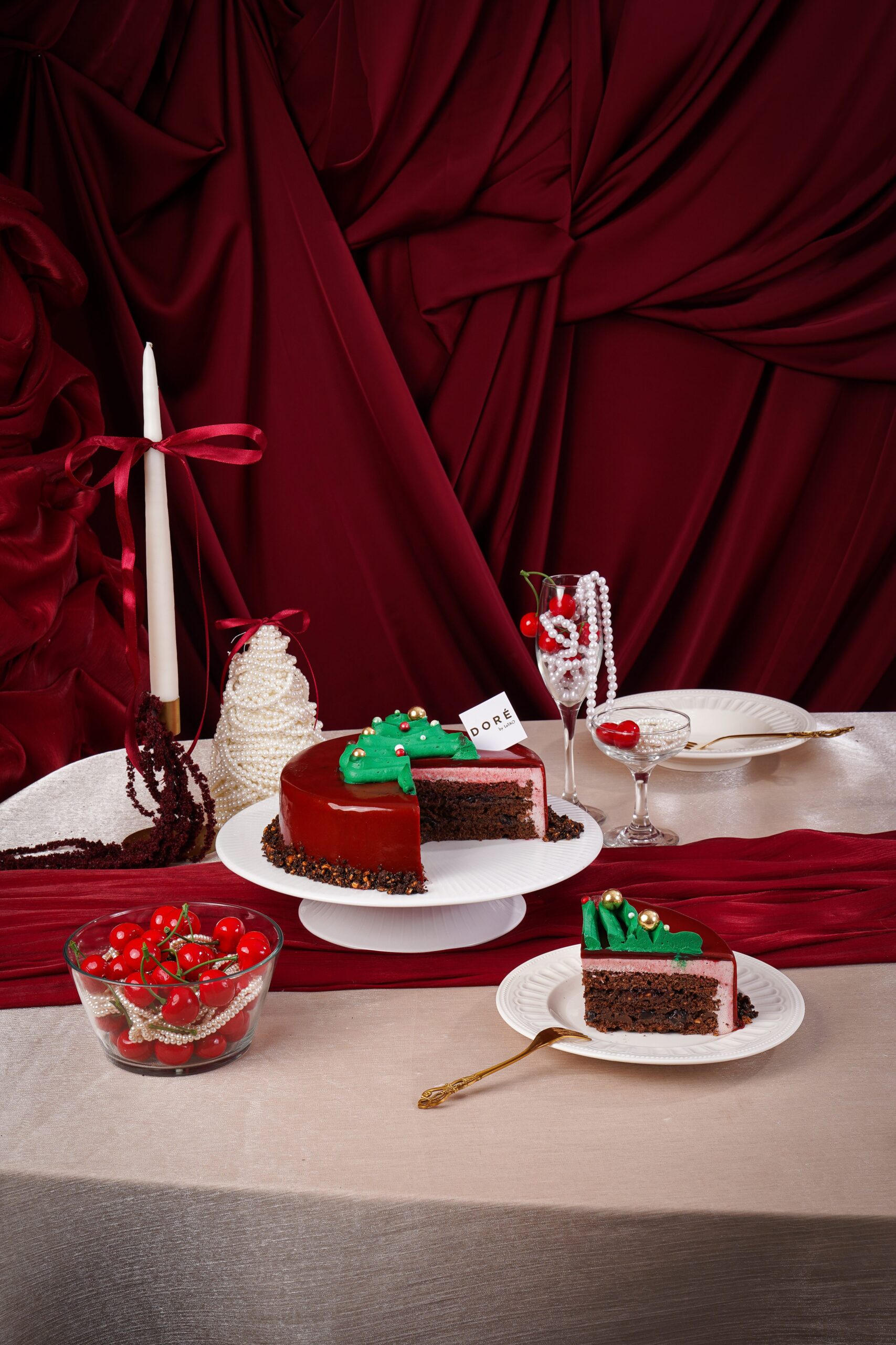 Layers of gluten-free chocolate sponge cake, cherry namelaka cream, dark cherry pieces, cherry mouse, finished with a radiant cherry glaze that glimmers like holiday lights and almond cacao crumbs. Each bite is a harmony of warmth and elegance.